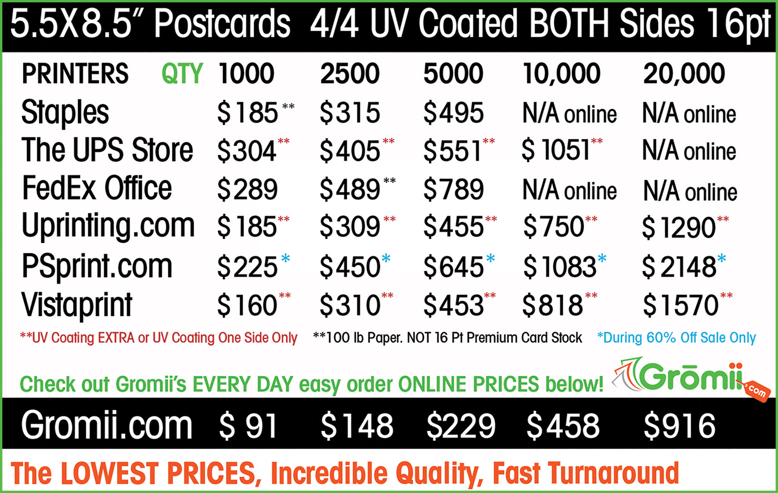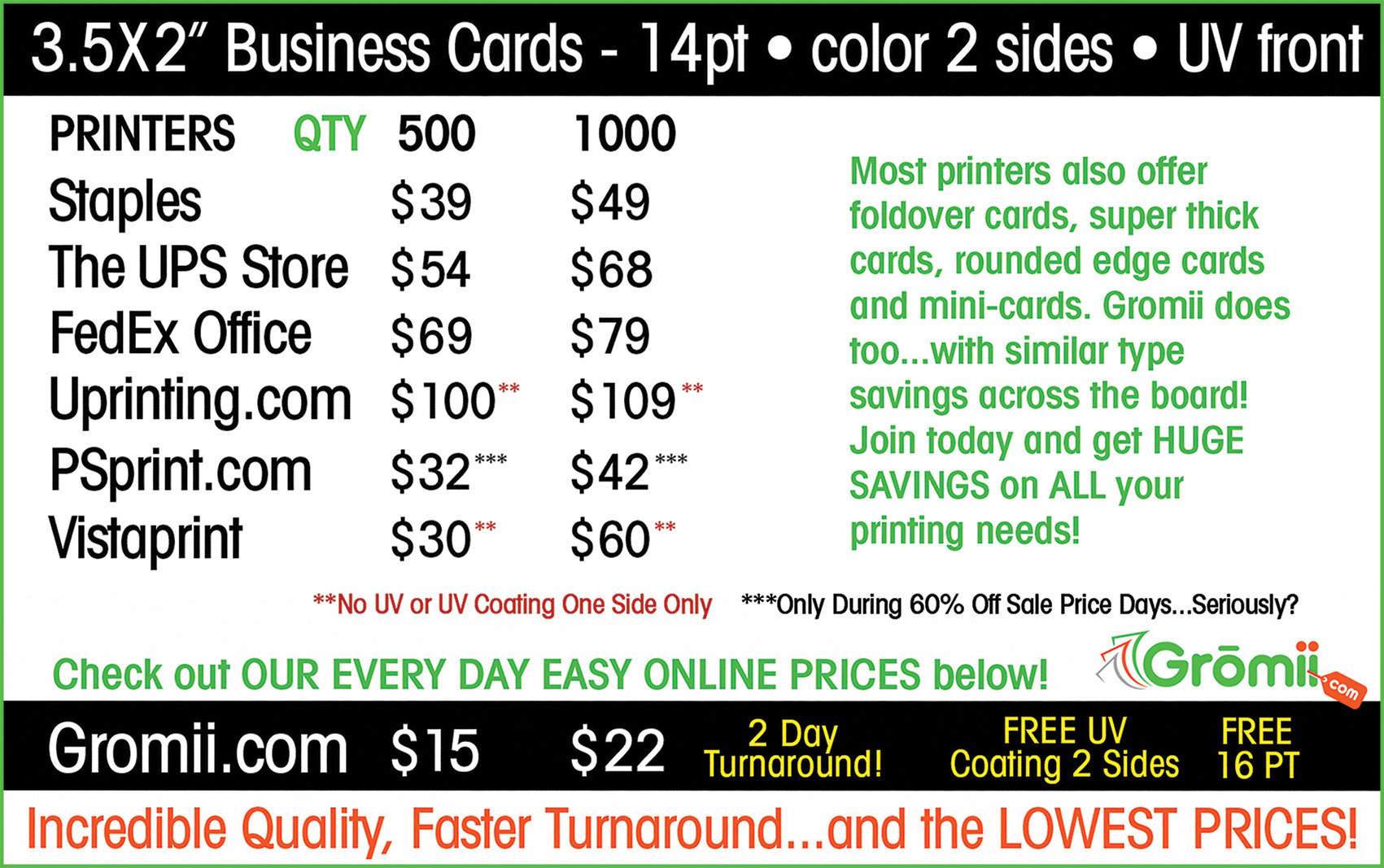 Are you using a local printer… or maybe Vistaprint? Ouch! Compare our everyday prices first!